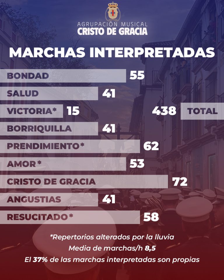 438 composiciones interpretadas, de Sábado de Bondad a Domingo de Resurrección, con un ritmo medio de 8,5 marchas/hora.