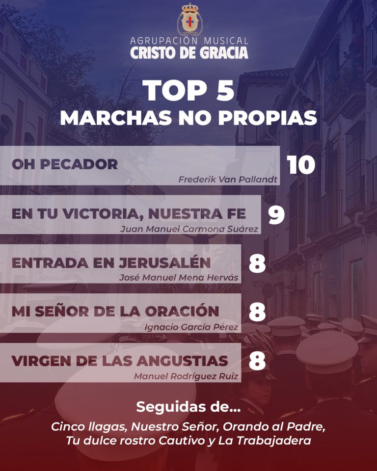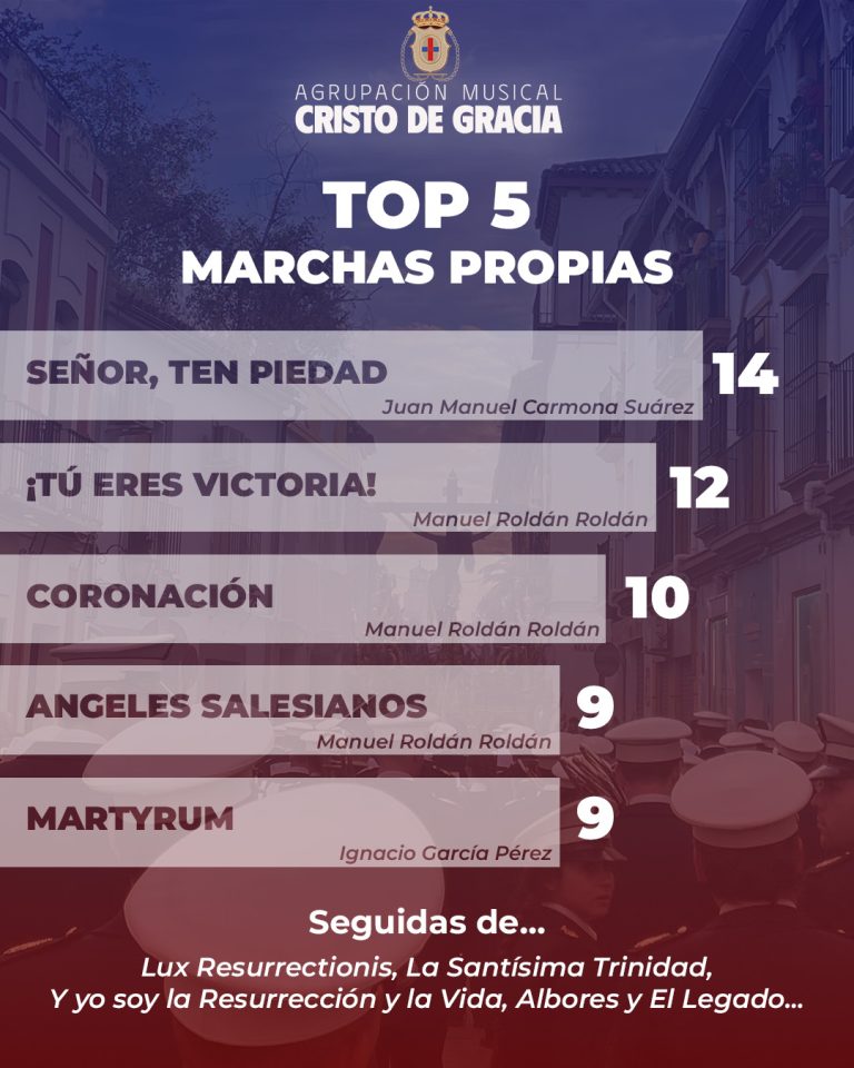 → «Coronación» de Manuel Roldán Roldán, nuestra mítica marcha que nunca se escapa de este pódium. Es la única interpretada todos los días de la Semana Santa.