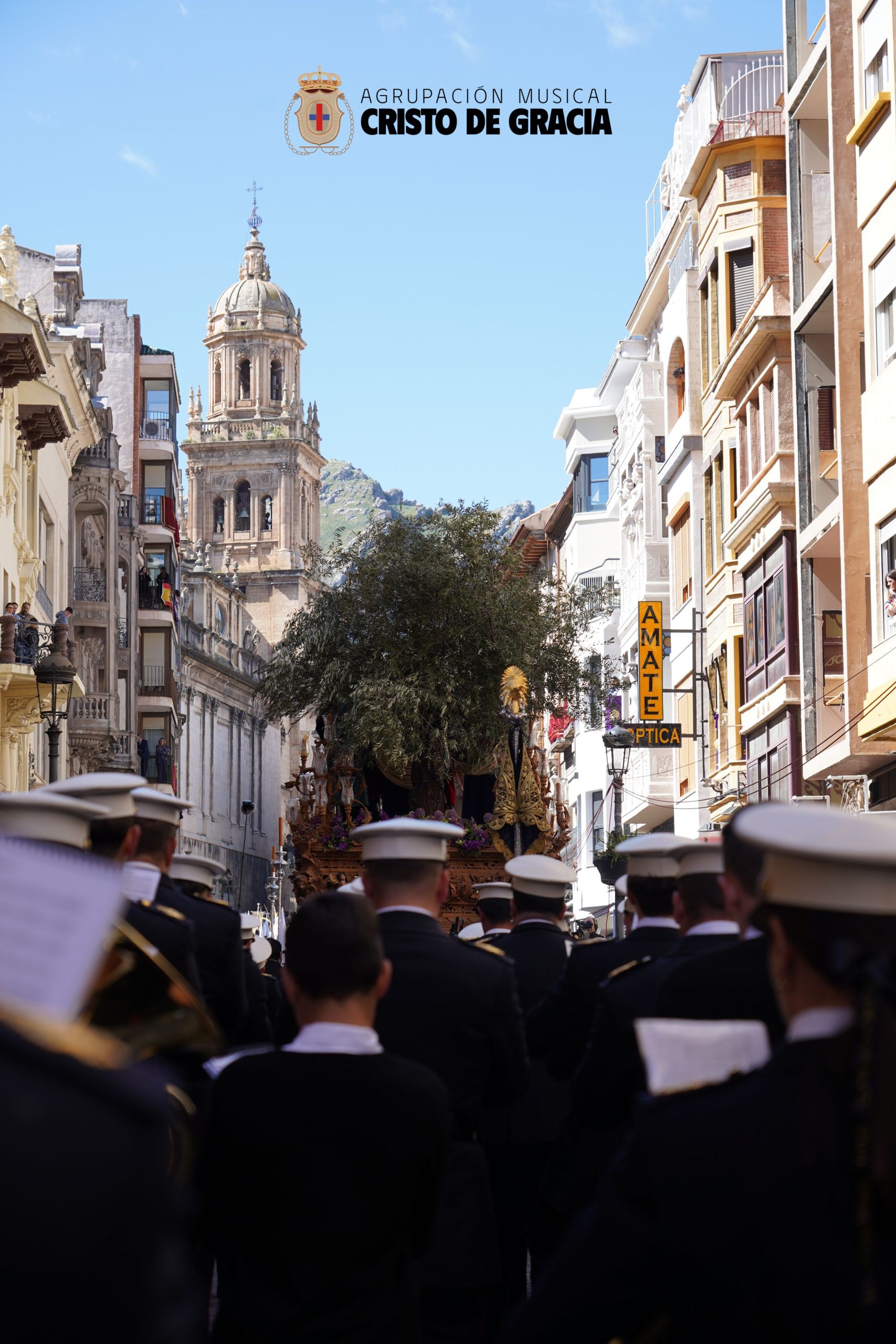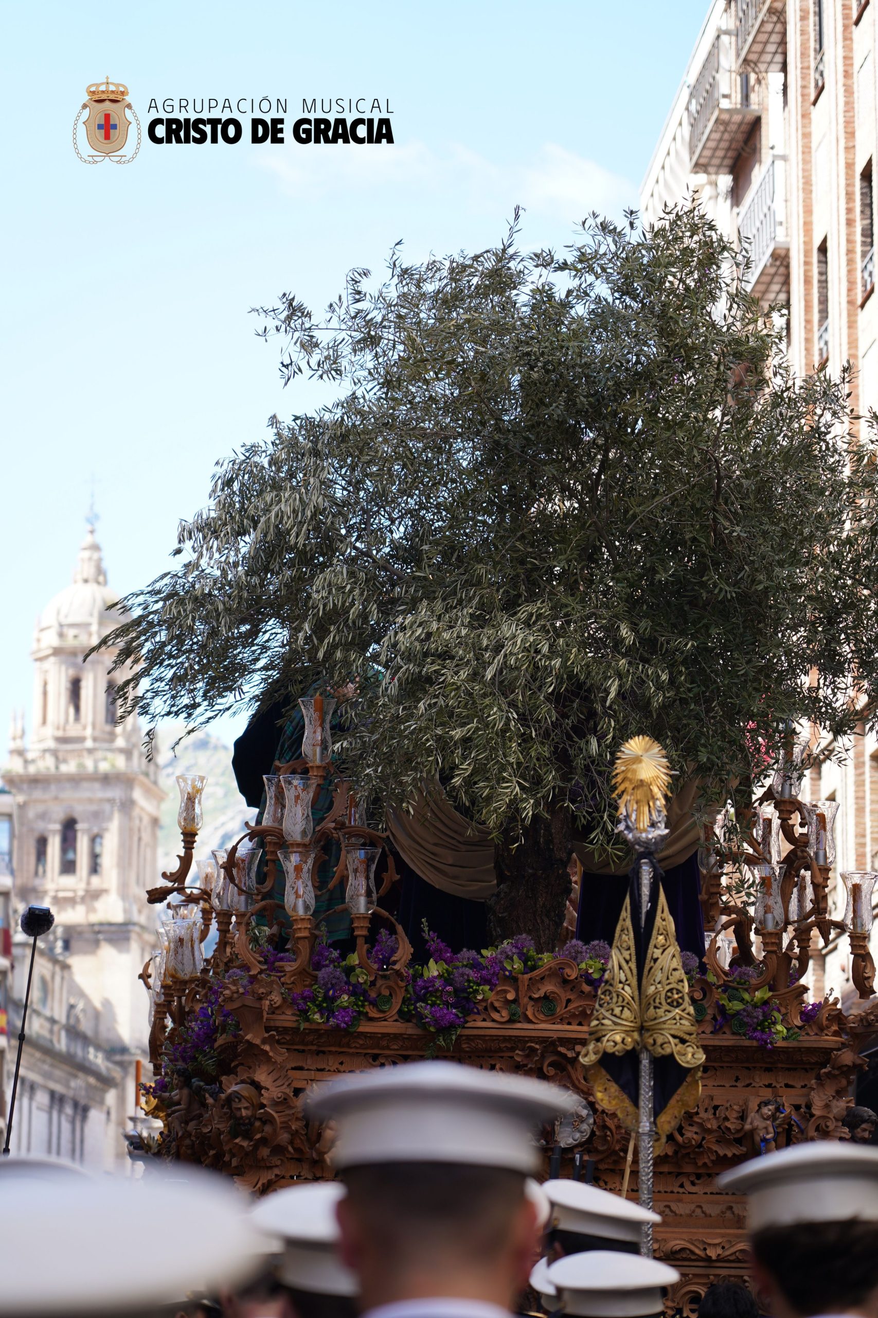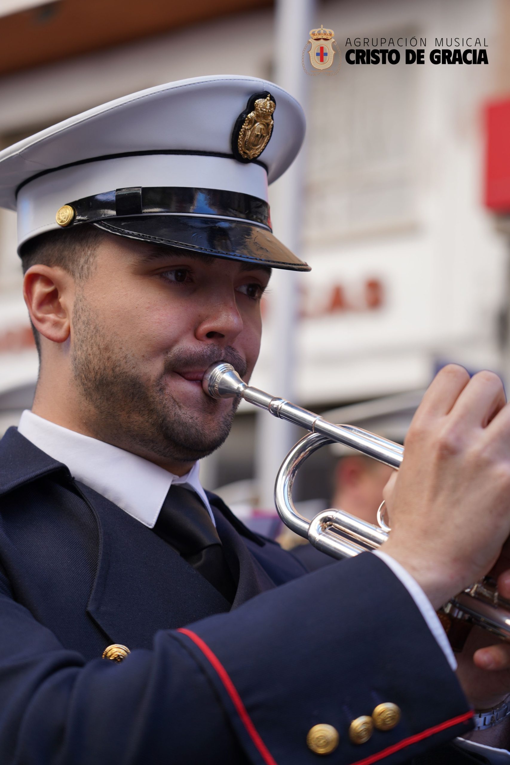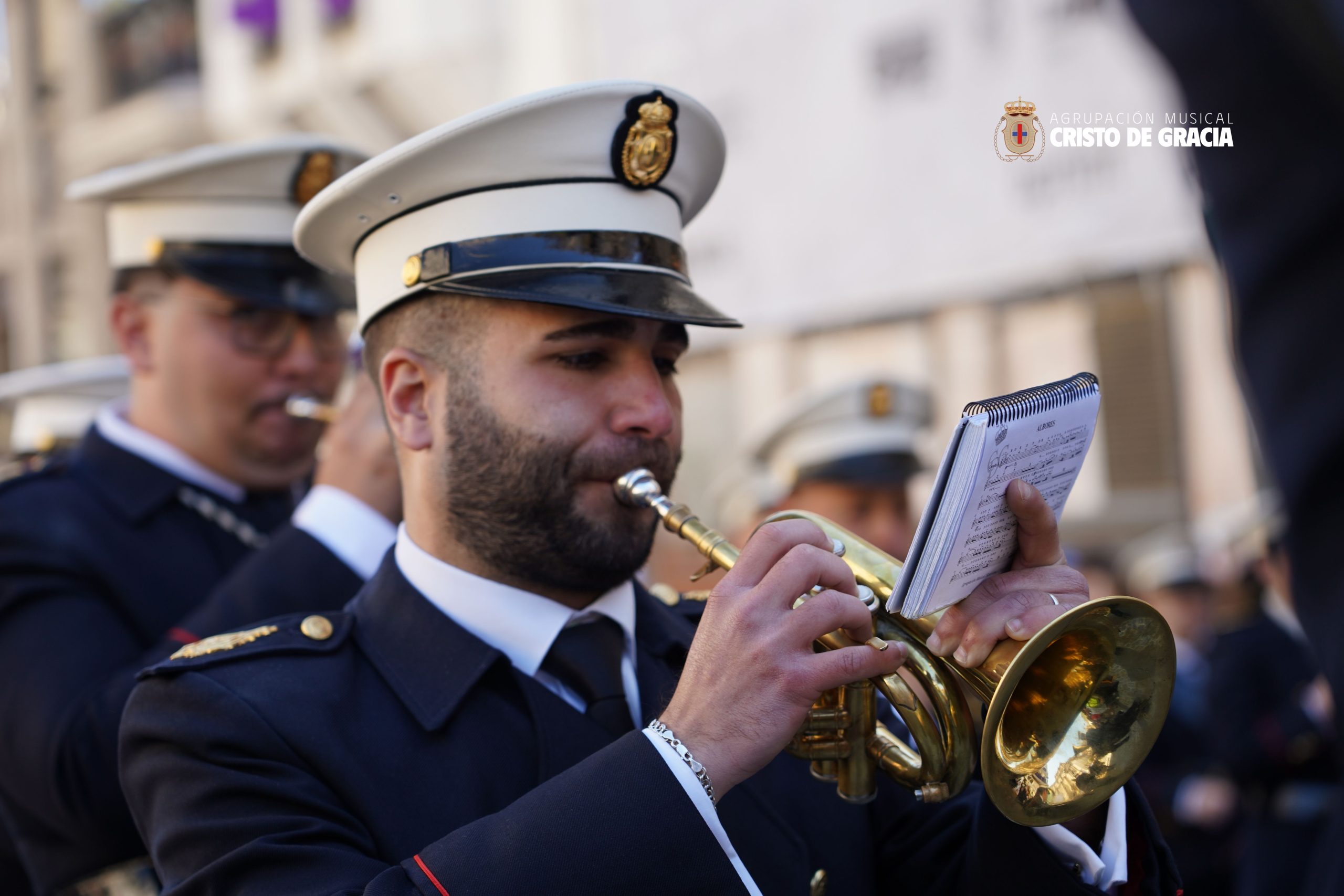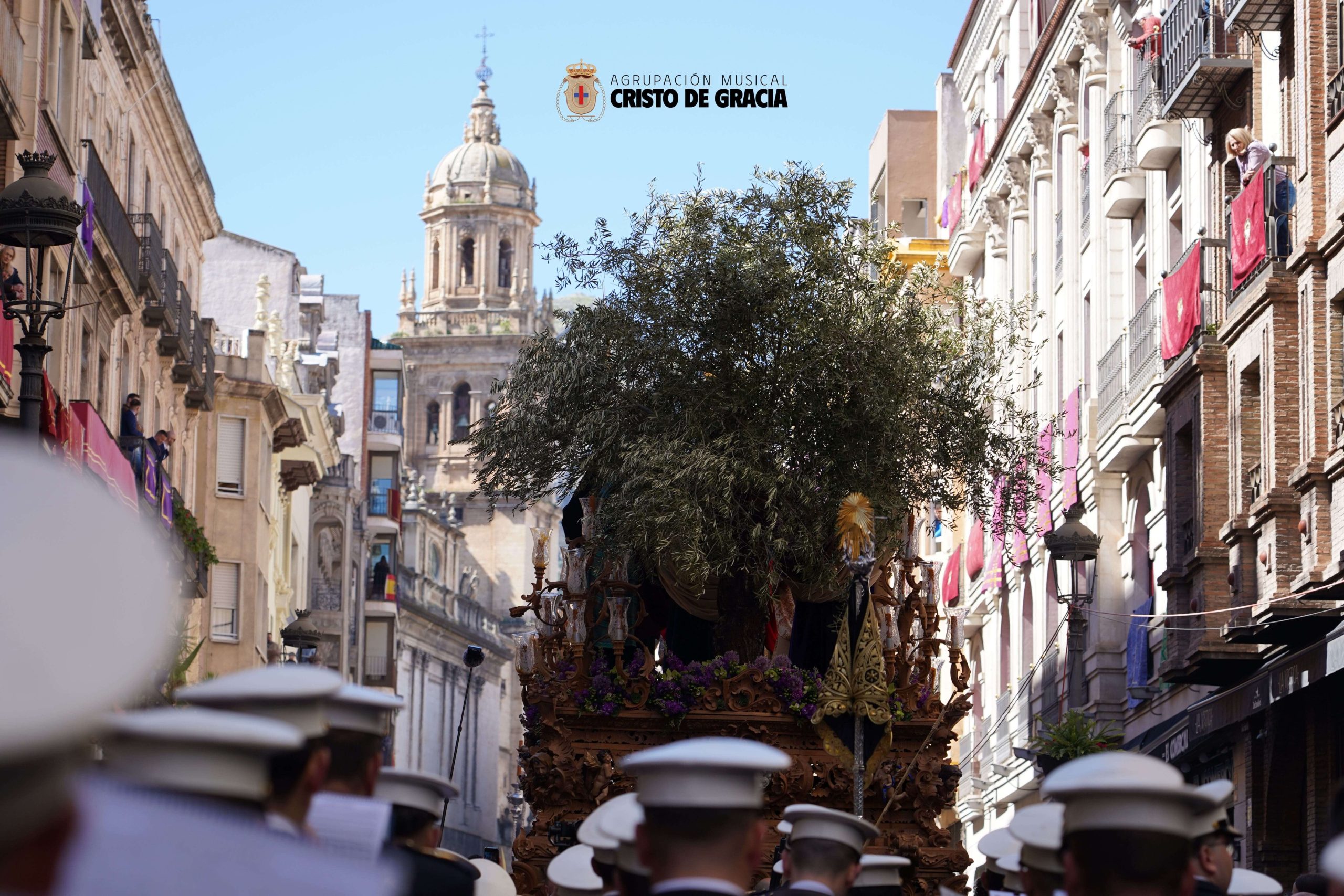 Con el misterio ya discurriendo a buen ritmo en su camino hacia la Carrera Oficial, nuestra Agrupación Musical comenzó a desgranar su repertorio. Uno de los instantes más bellos e íntimos del recorrido se vivió al alcanzar la imponente estrechez de la calle Almenas. Allí, la conjunción entre la cuadrilla y nuestros sones se hizo palpable; marchas como Entrada en Jerusalén, Tu Mirada, La Santísima Trinidad y Santo es el Señor resonaron abrazando al Señor de la Salud entre los estrechos muros.