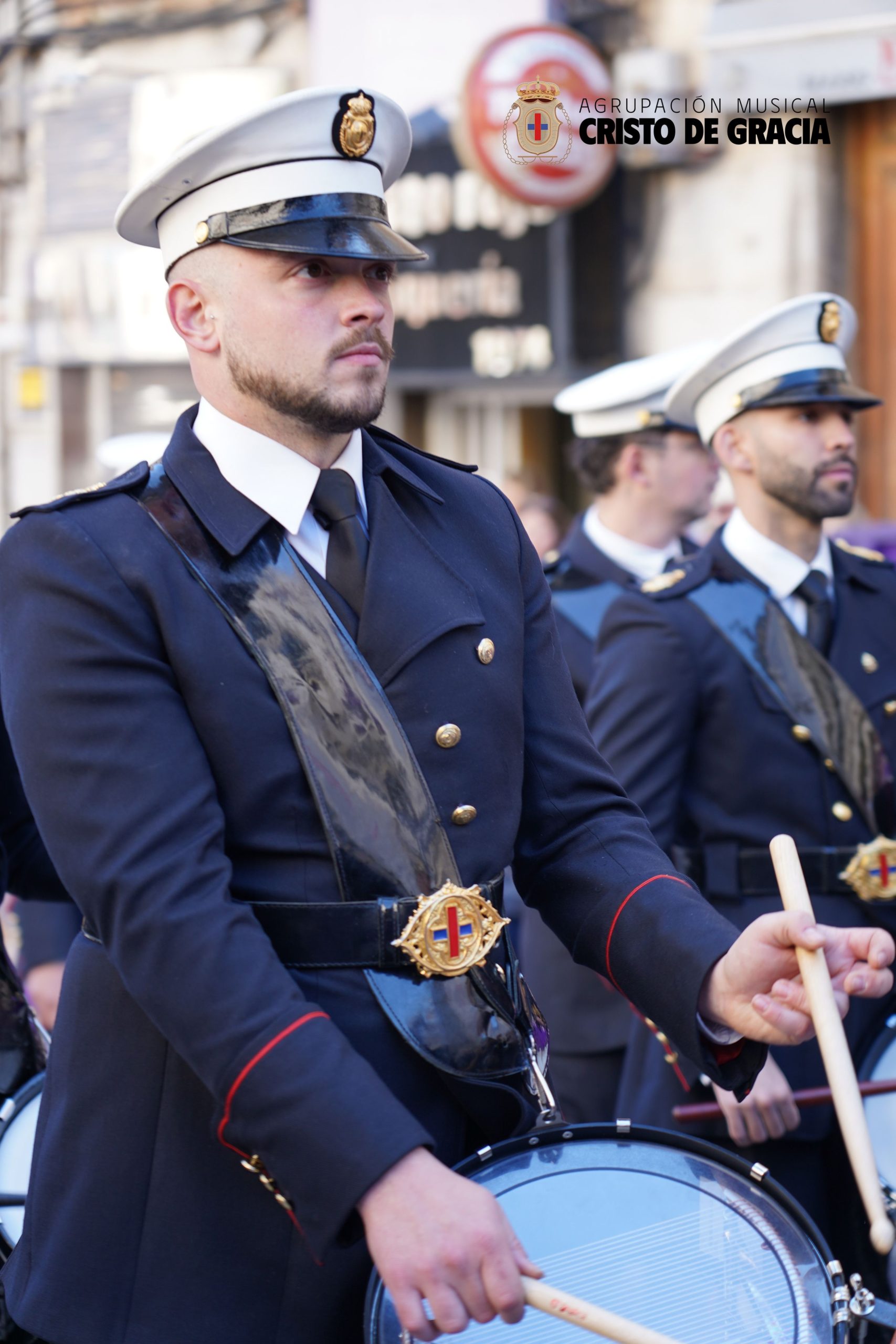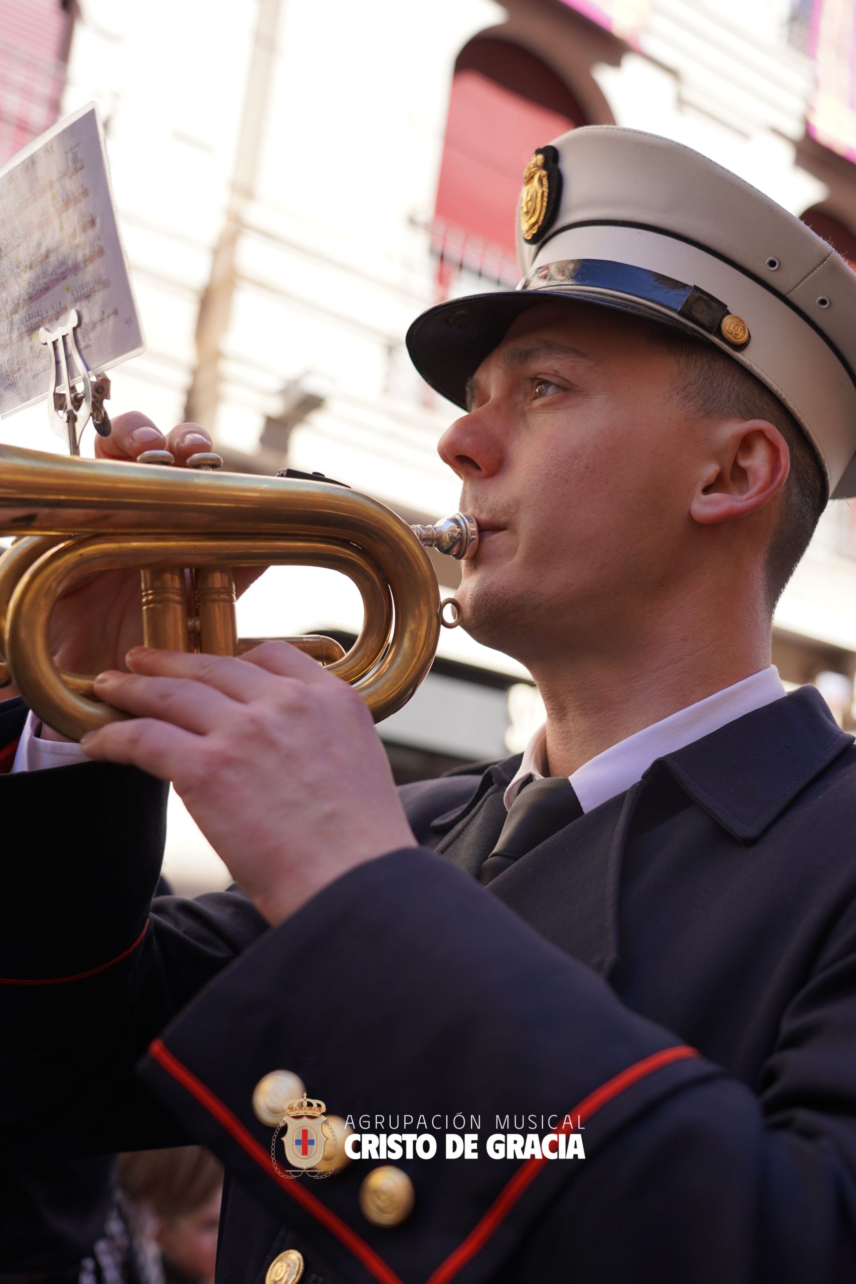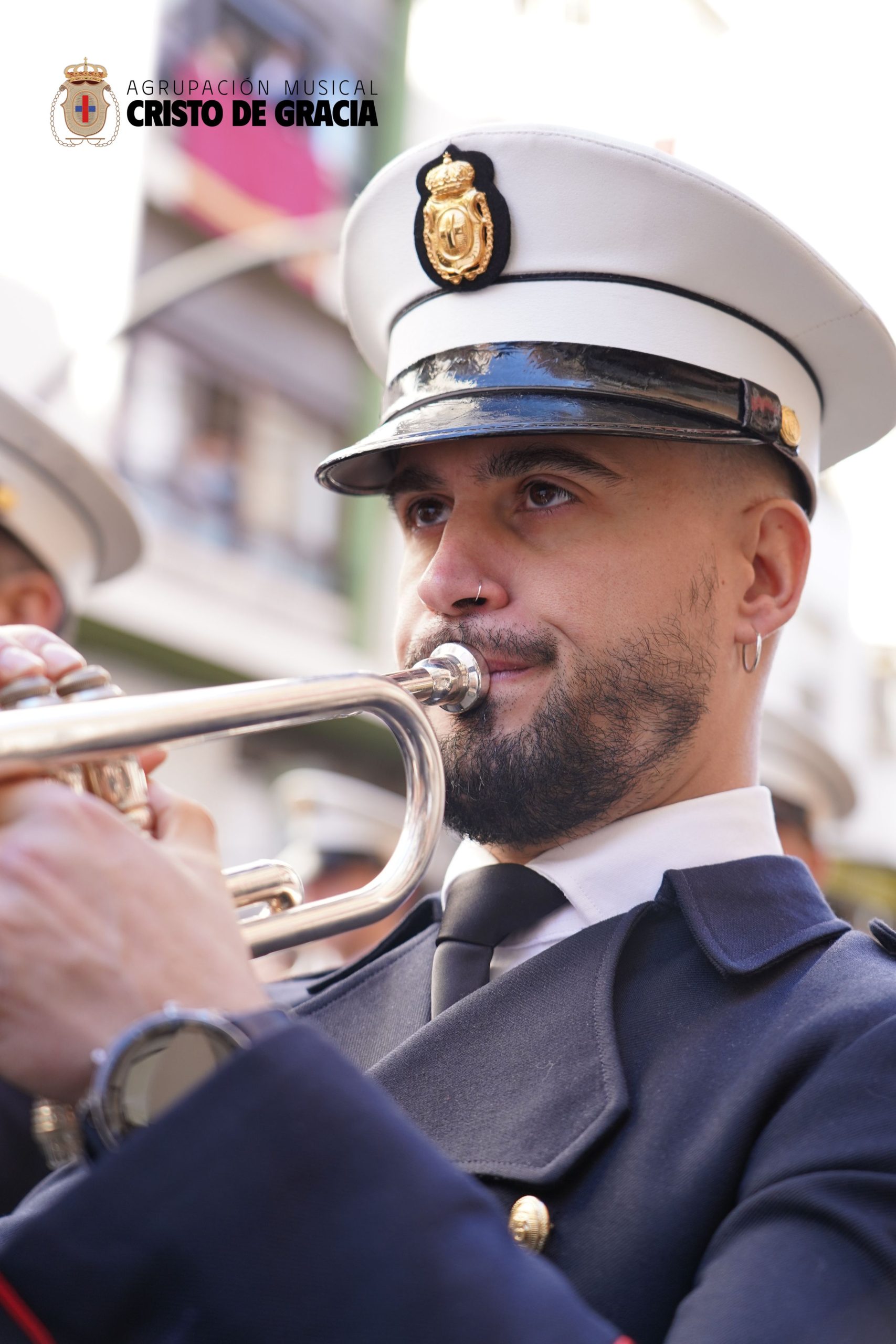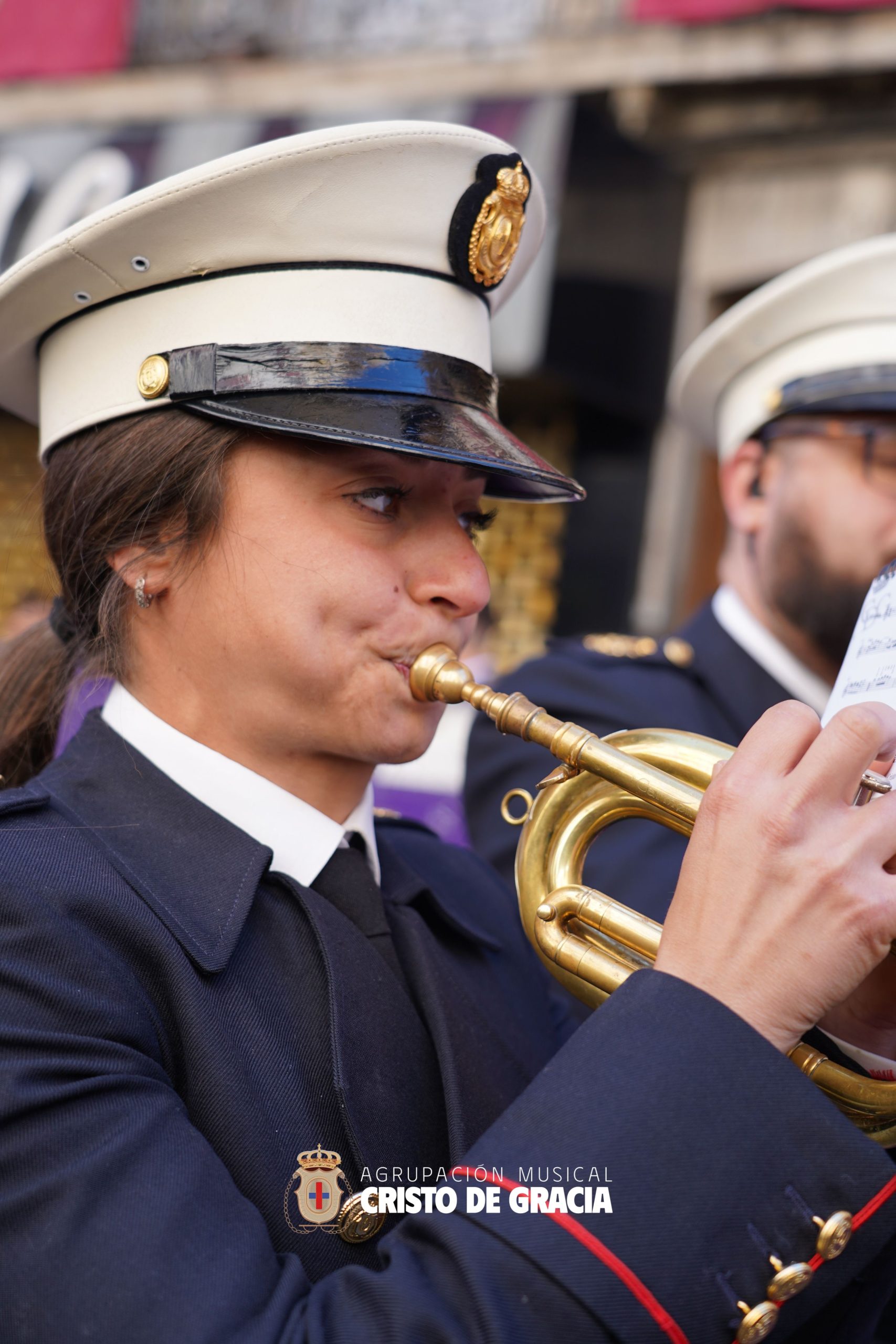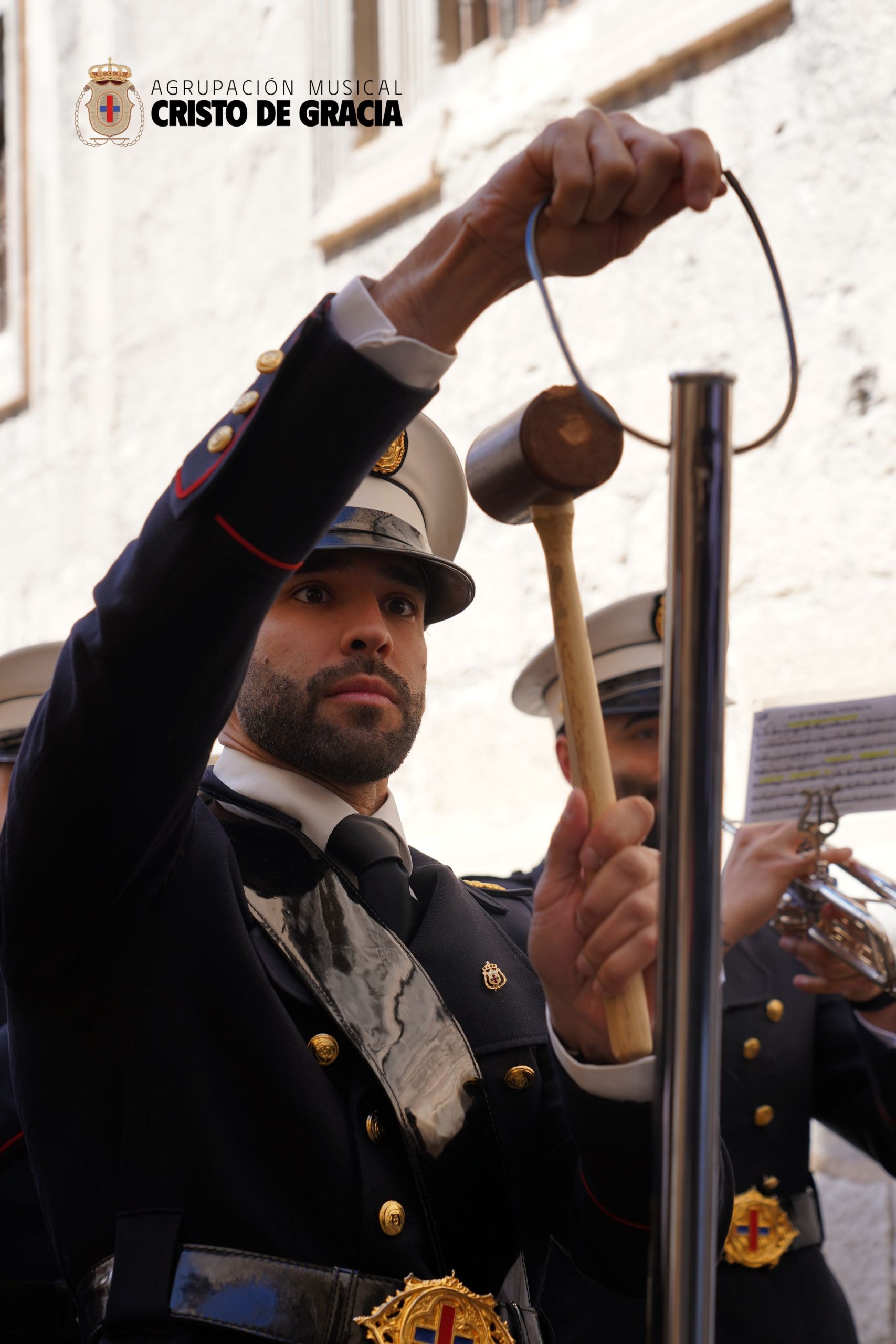 Con el misterio ya discurriendo a buen ritmo en su camino hacia la Carrera Oficial, nuestra Agrupación Musical comenzó a desgranar su repertorio. Uno de los instantes más bellos e íntimos del recorrido se vivió al alcanzar la imponente estrechez de la calle Almenas. Allí, la conjunción entre la cuadrilla y nuestros sones se hizo palpable; marchas como Entrada en Jerusalén, Tu Mirada, La Santísima Trinidad y Santo es el Señor resonaron abrazando al Señor de la Salud entre los estrechos muros.