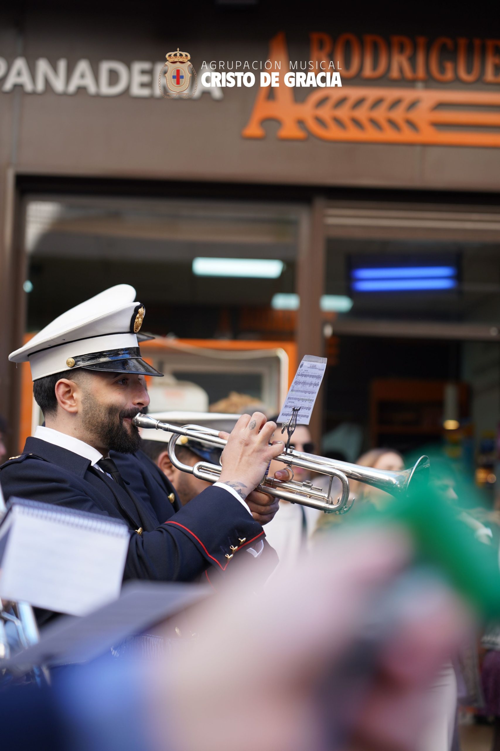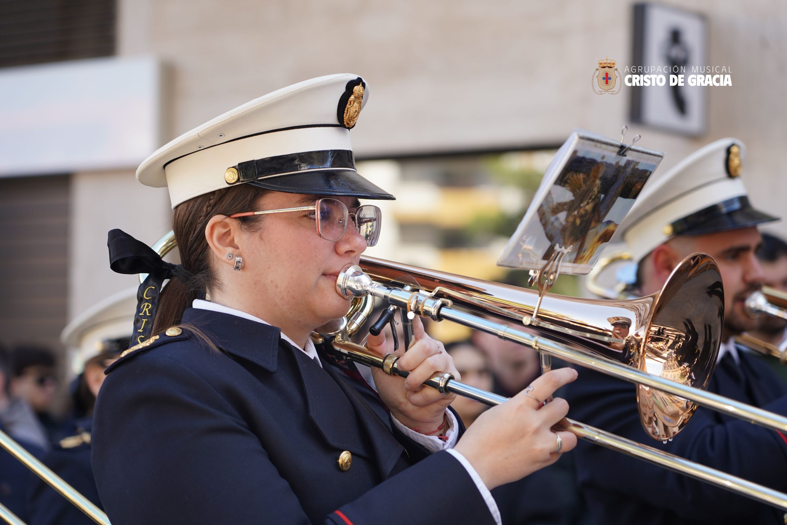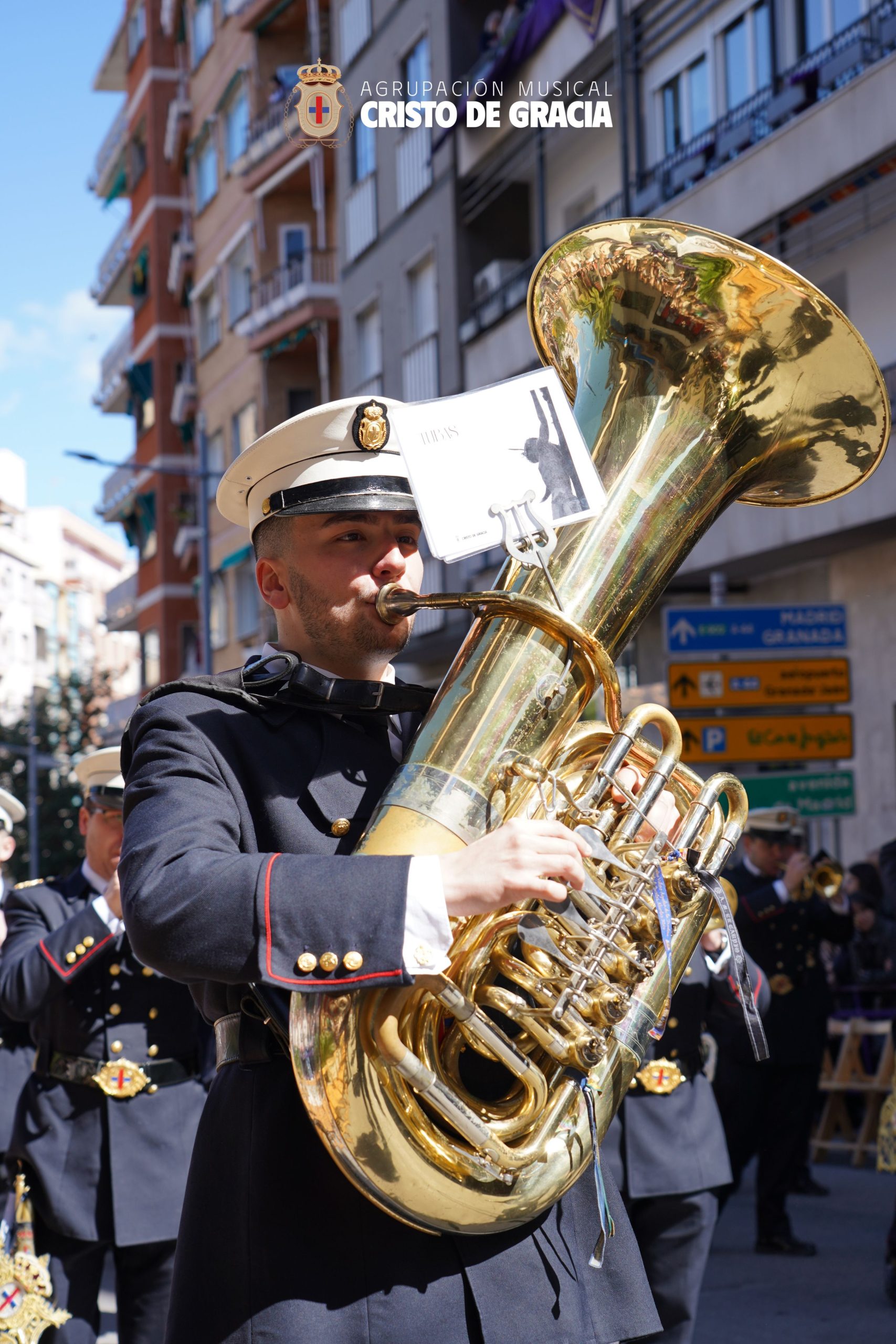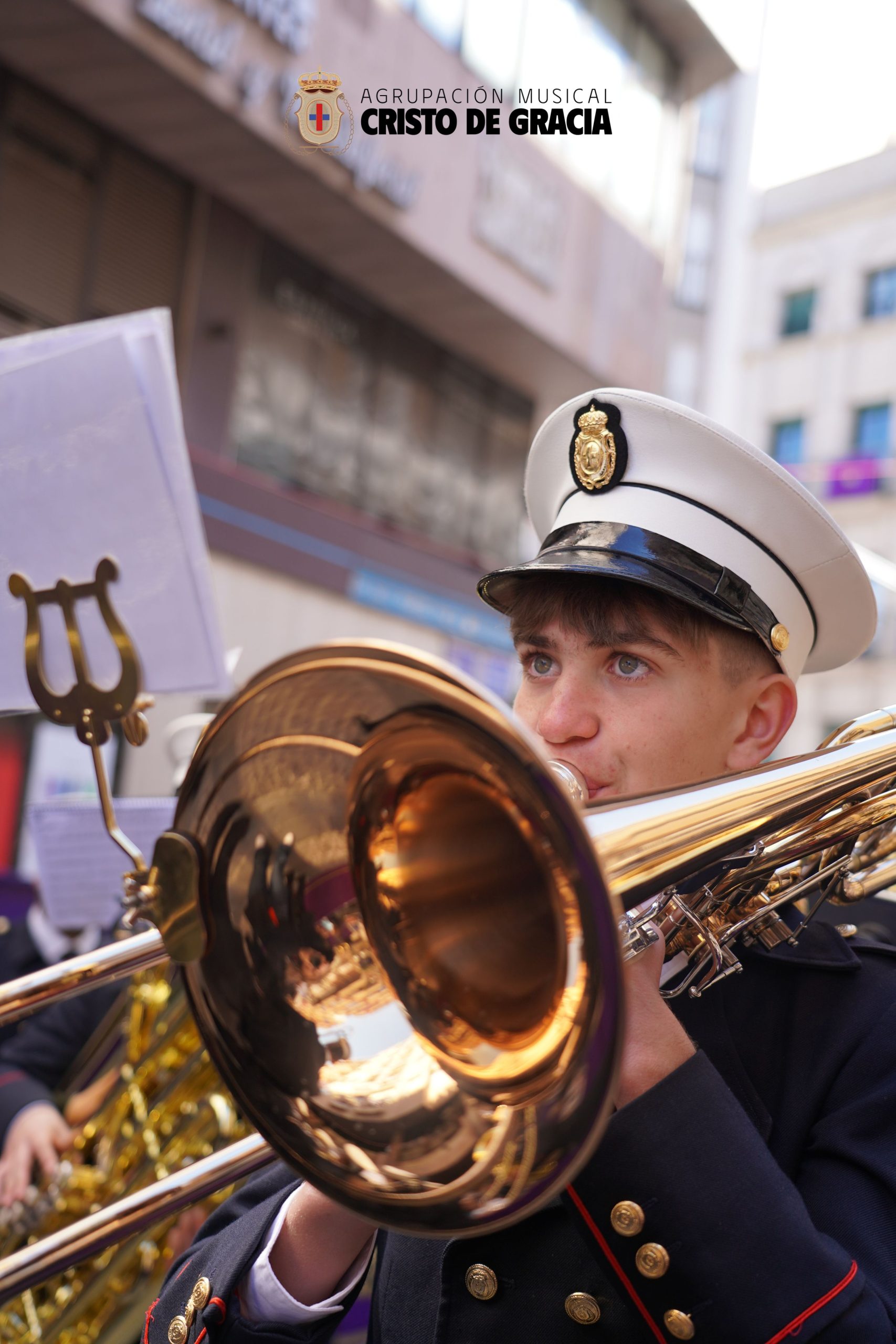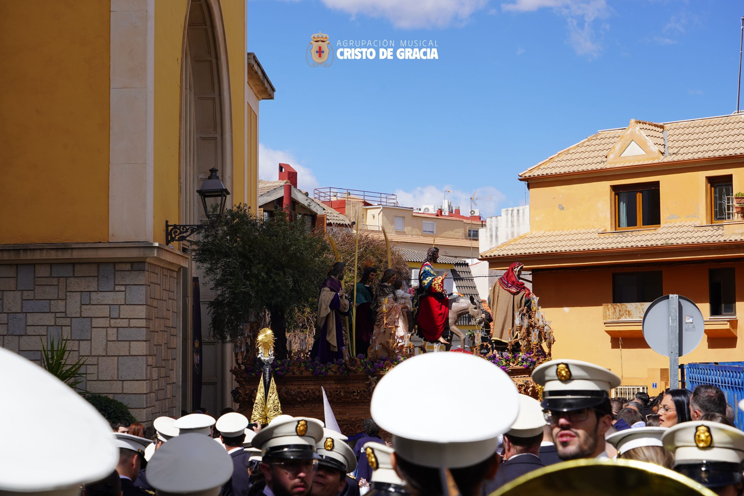 Con el misterio ya discurriendo a buen ritmo en su camino hacia la Carrera Oficial, nuestra Agrupación Musical comenzó a desgranar su repertorio. Uno de los instantes más bellos e íntimos del recorrido se vivió al alcanzar la imponente estrechez de la calle Almenas. Allí, la conjunción entre la cuadrilla y nuestros sones se hizo palpable; marchas como Entrada en Jerusalén, Tu Mirada, La Santísima Trinidad y Santo es el Señor resonaron abrazando al Señor de la Salud entre los estrechos muros.