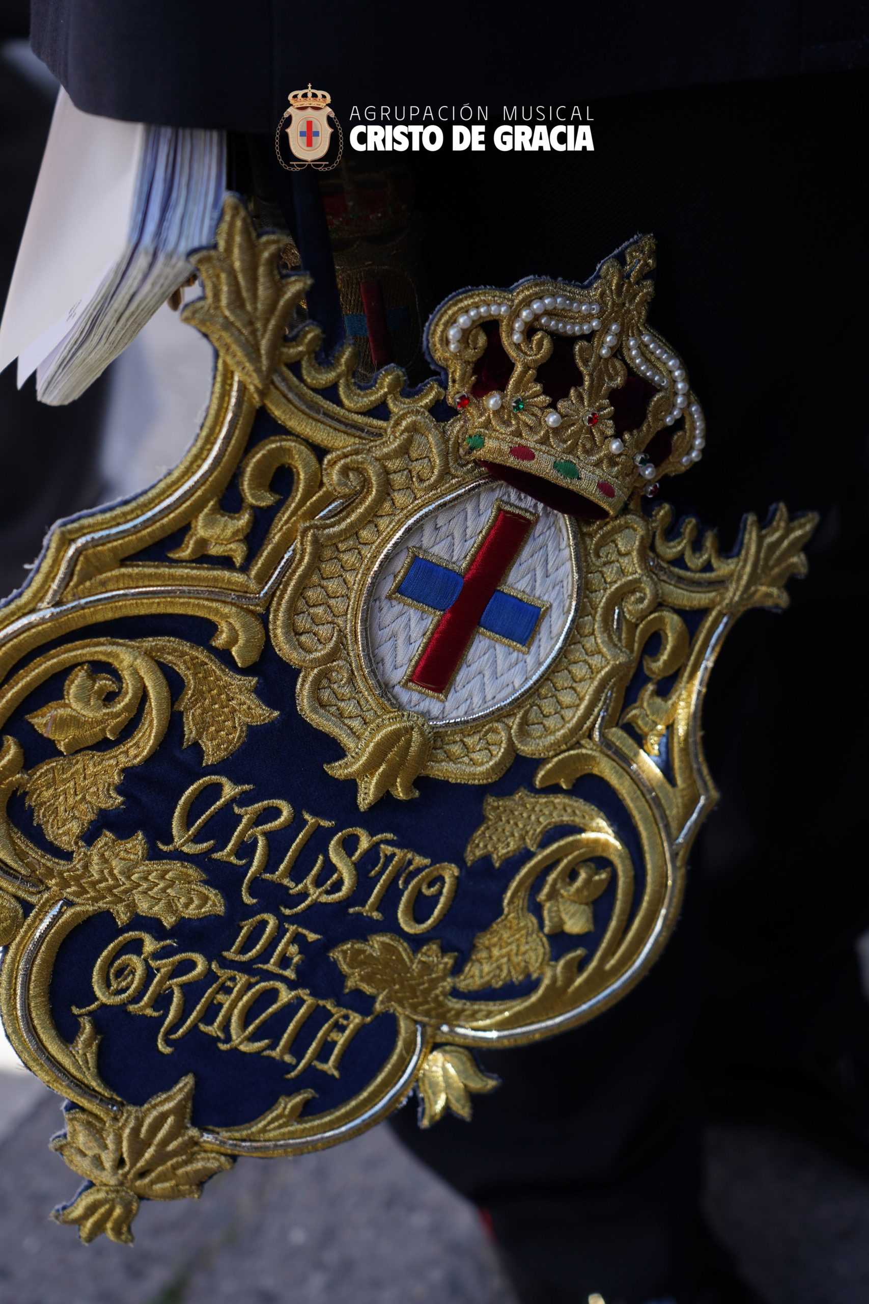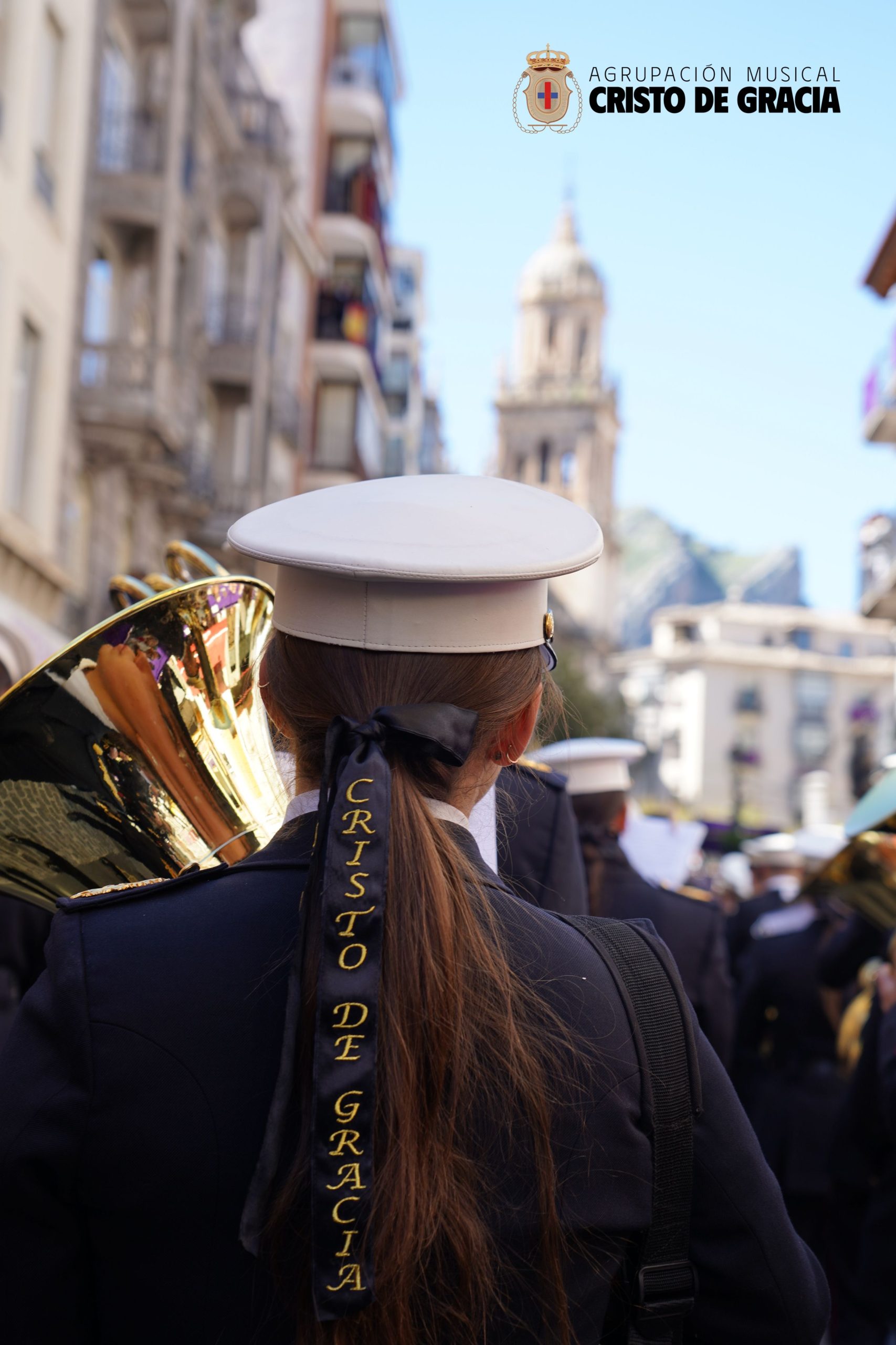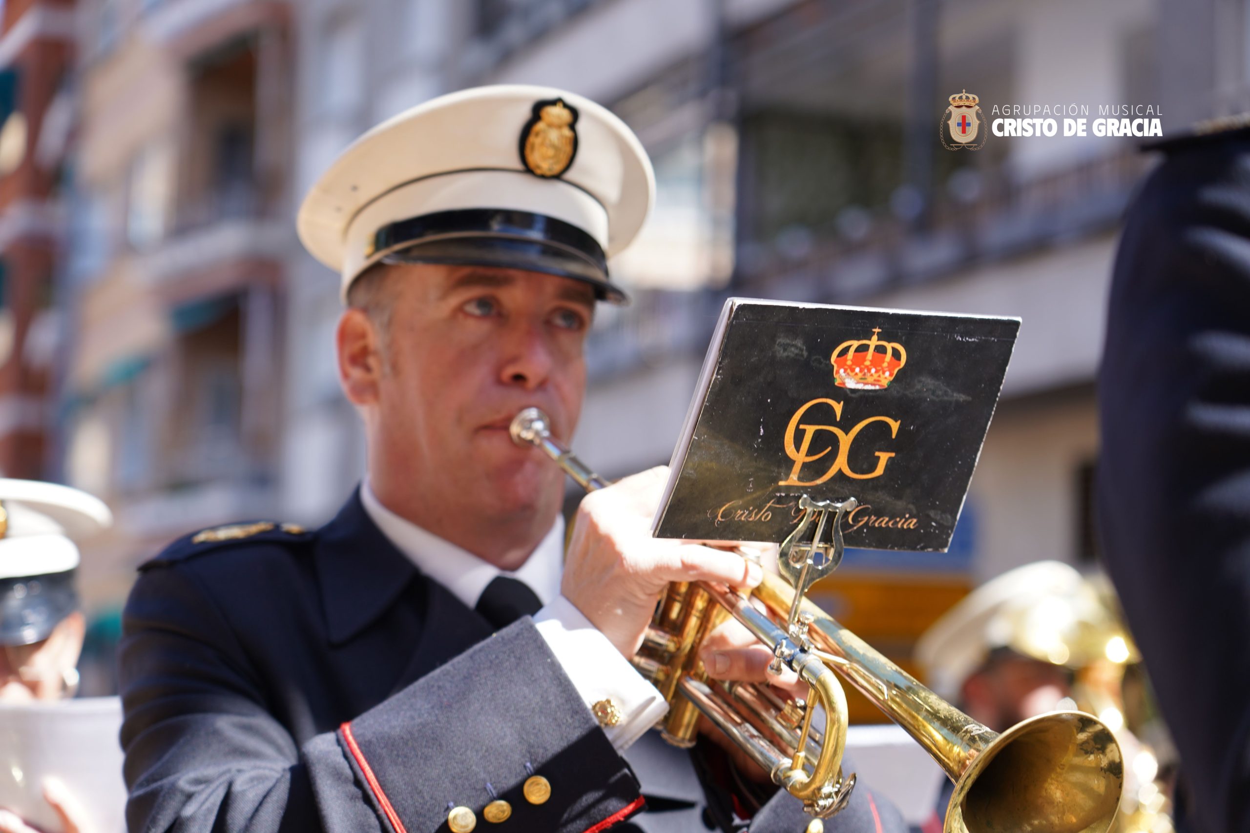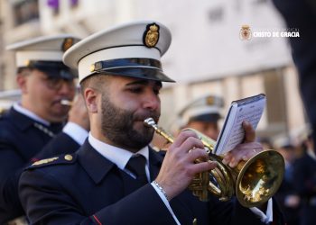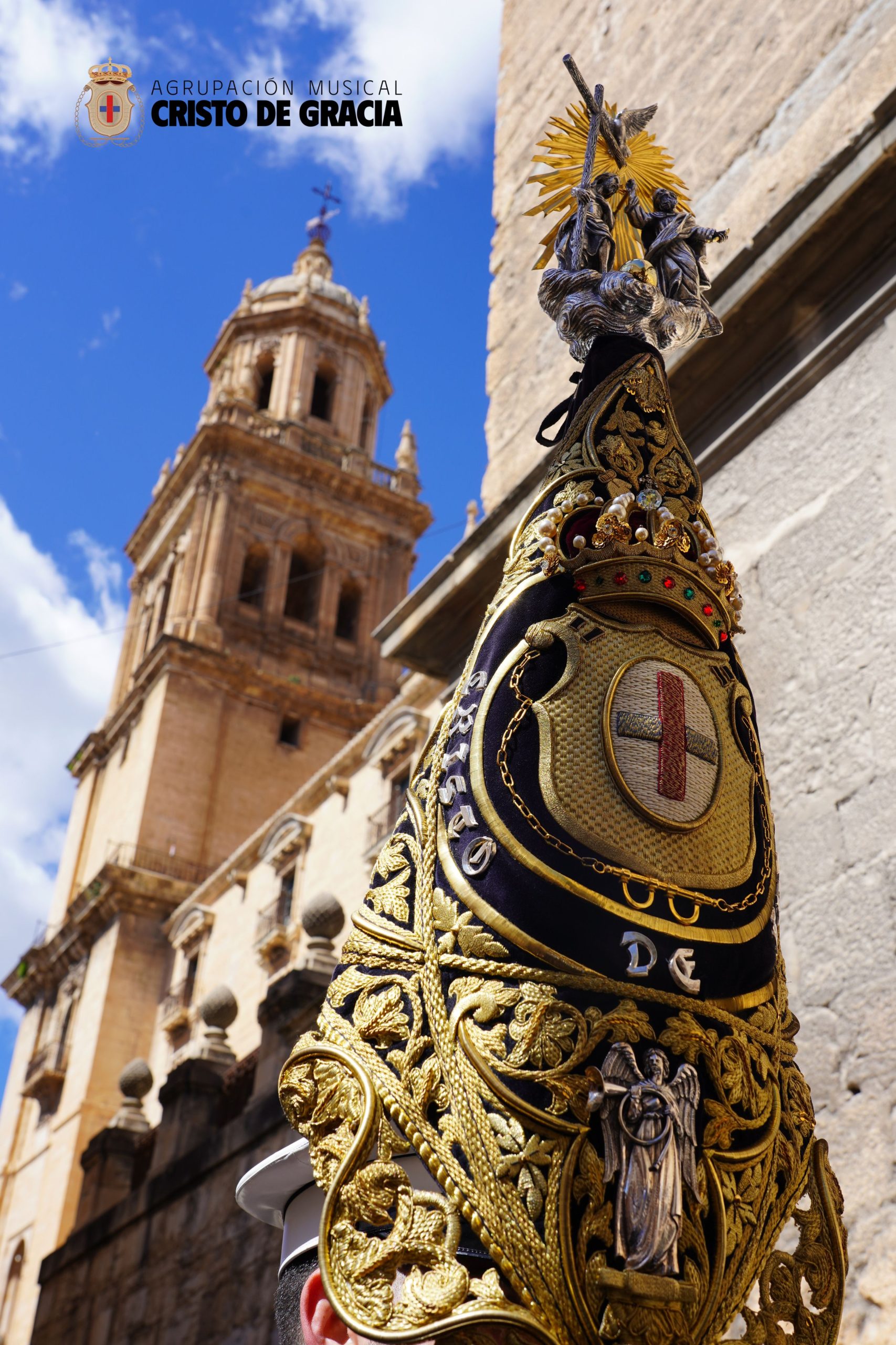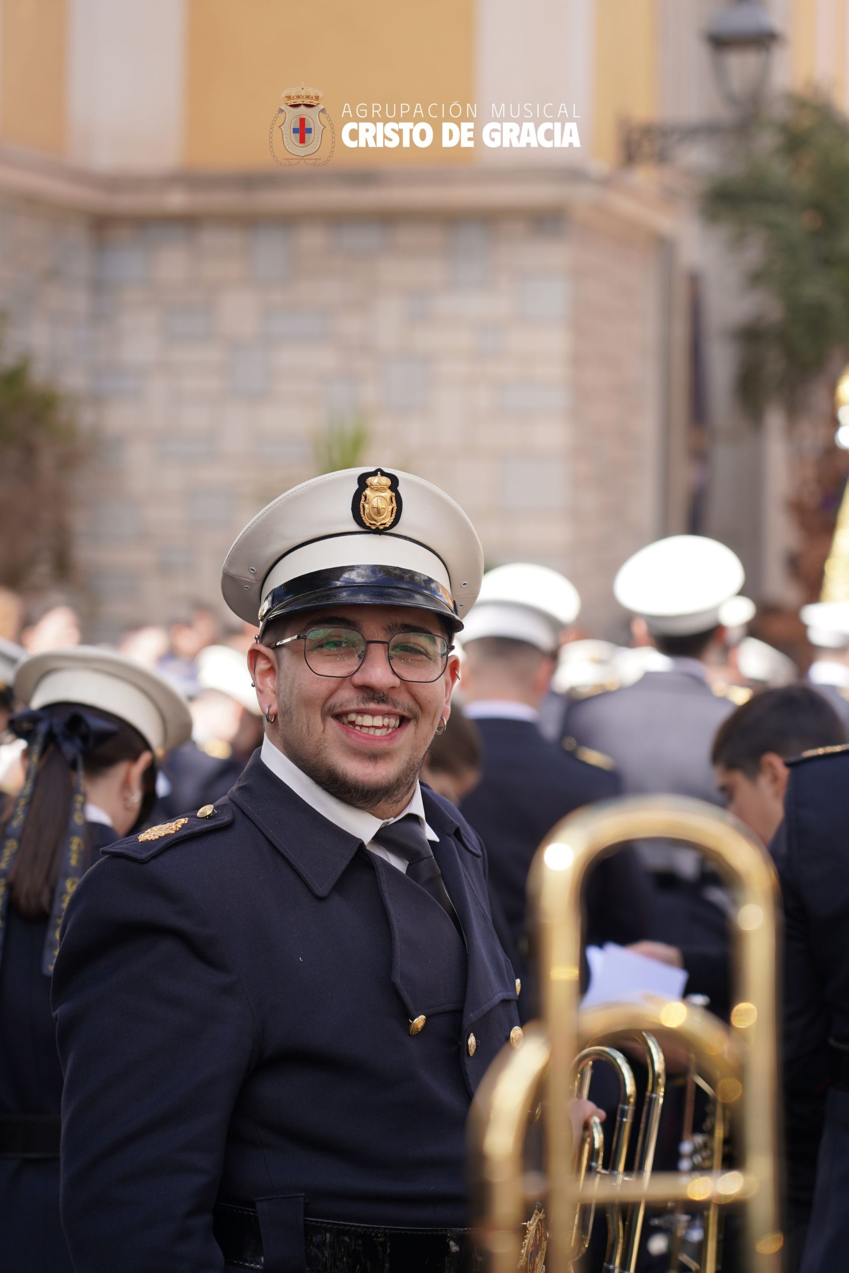 Con el misterio ya discurriendo a buen ritmo en su camino hacia la Carrera Oficial, nuestra Agrupación Musical comenzó a desgranar su repertorio. Uno de los instantes más bellos e íntimos del recorrido se vivió al alcanzar la imponente estrechez de la calle Almenas. Allí, la conjunción entre la cuadrilla y nuestros sones se hizo palpable; marchas como Entrada en Jerusalén, Tu Mirada, La Santísima Trinidad y Santo es el Señor resonaron abrazando al Señor de la Salud entre los estrechos muros.