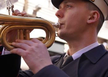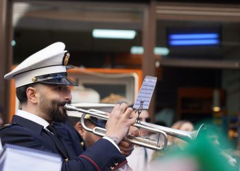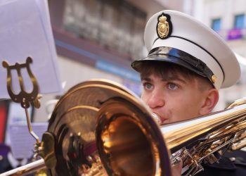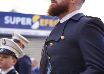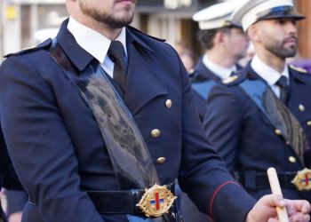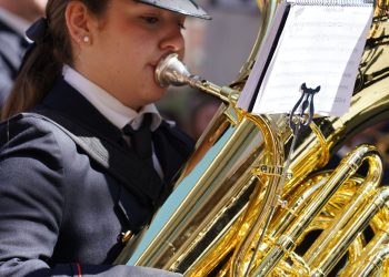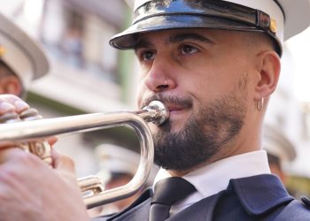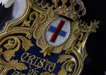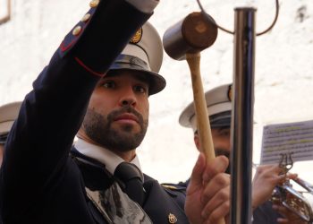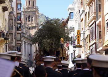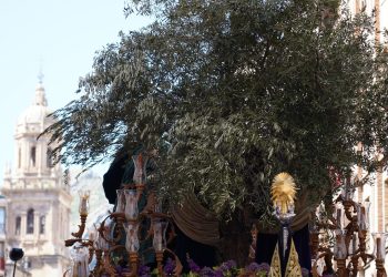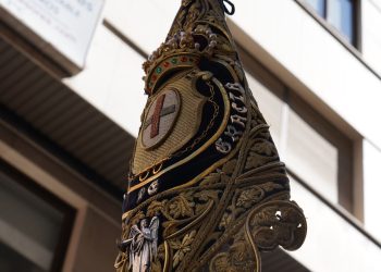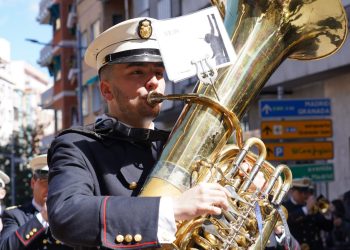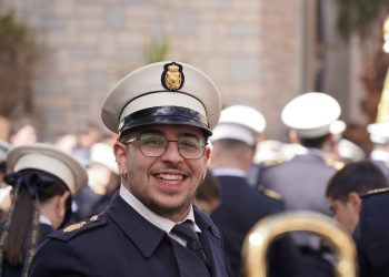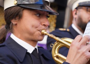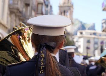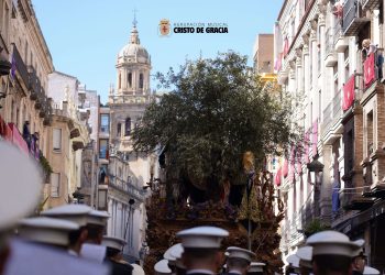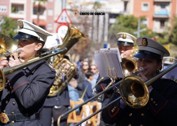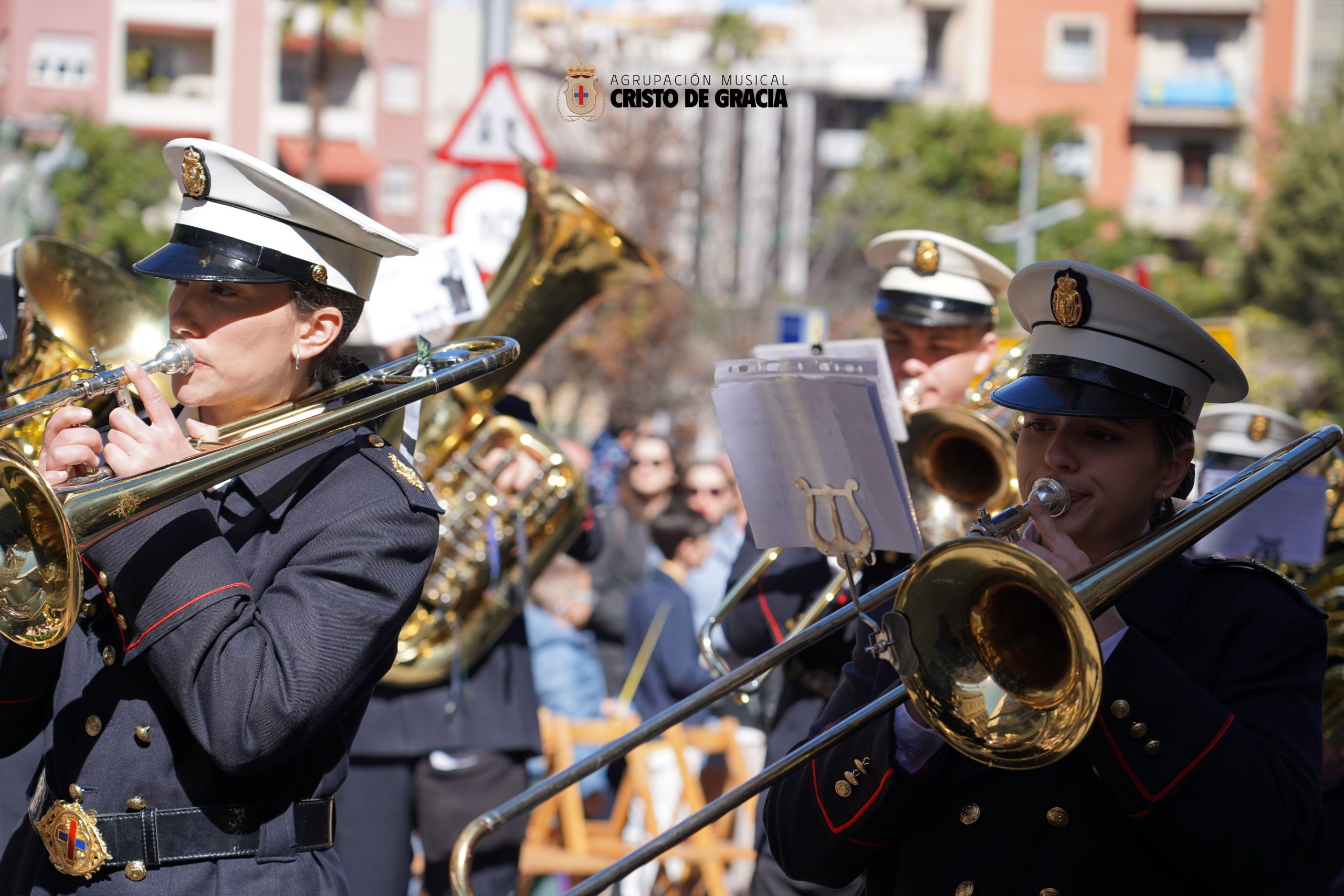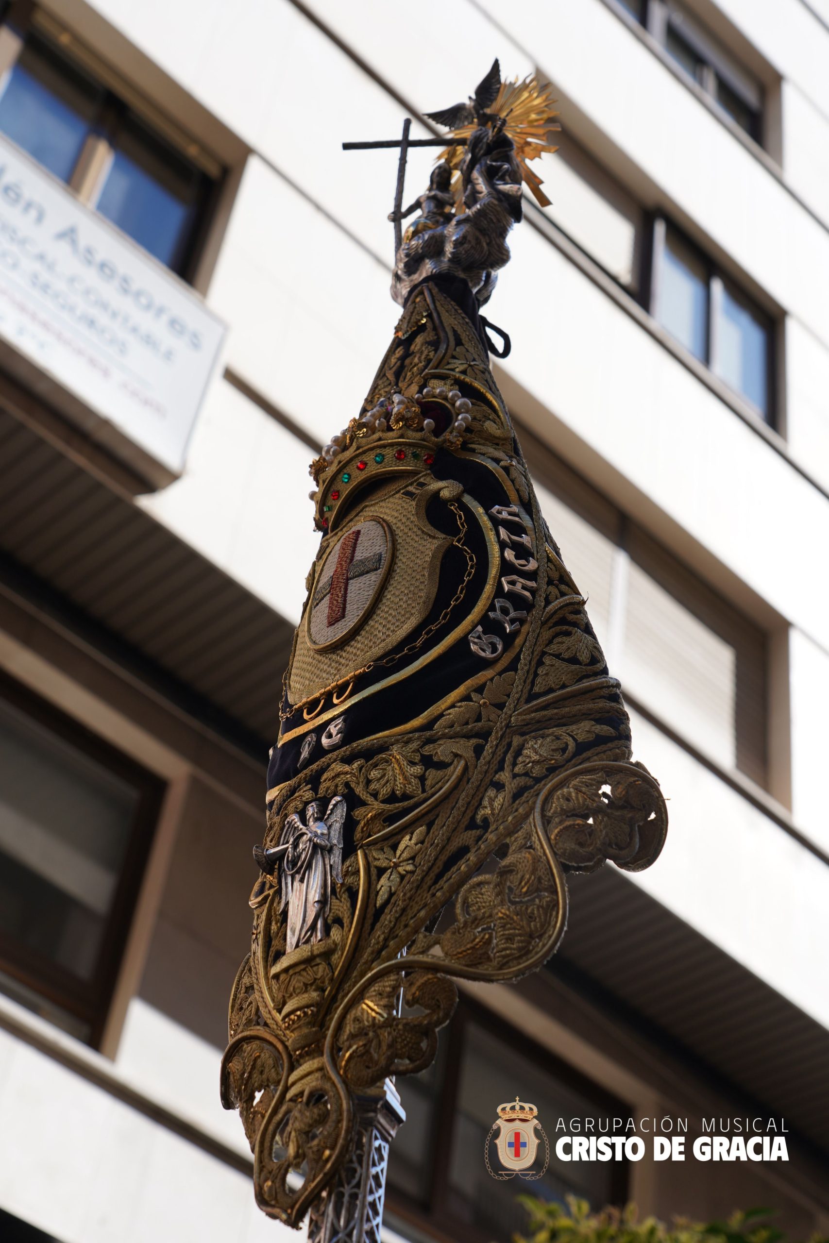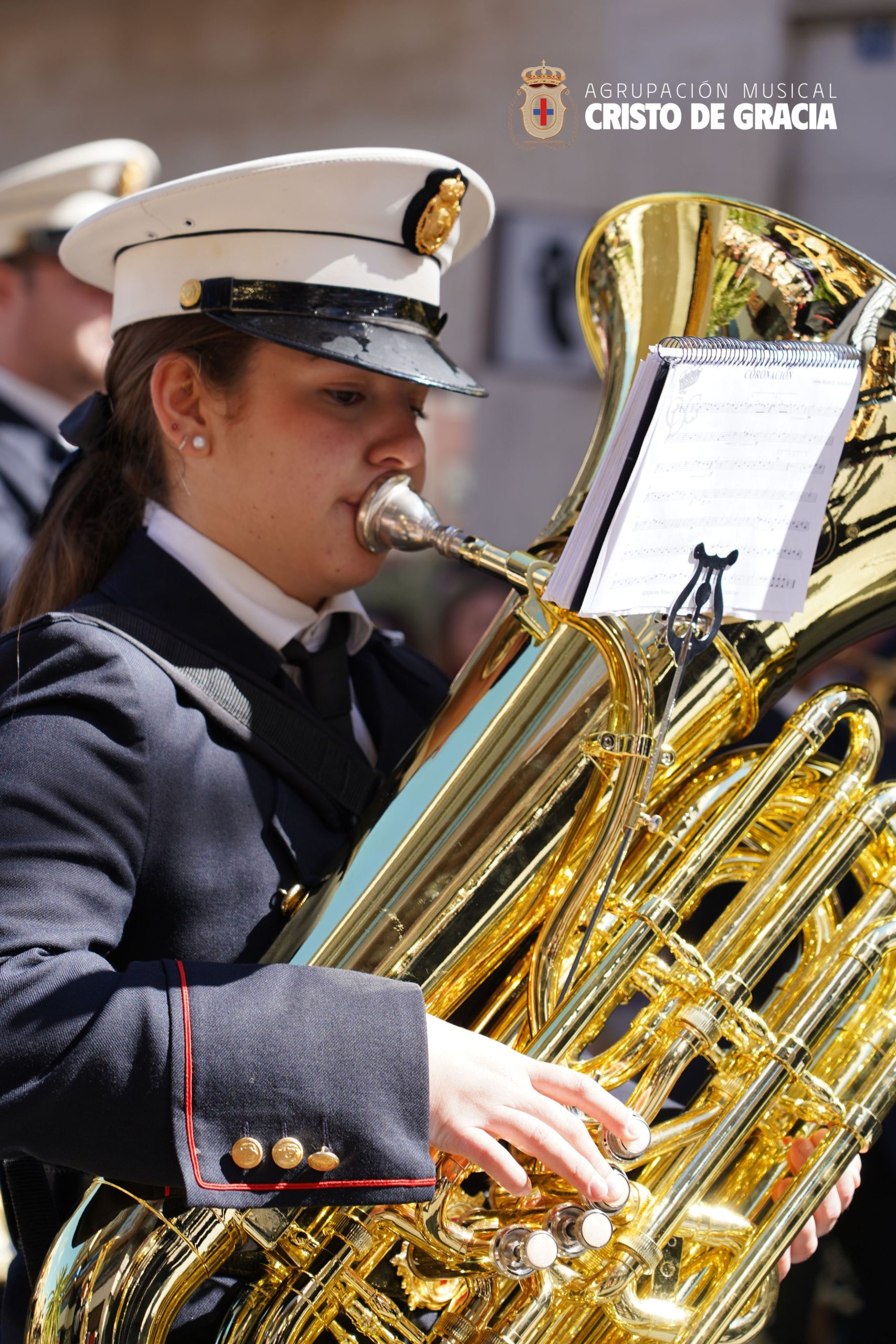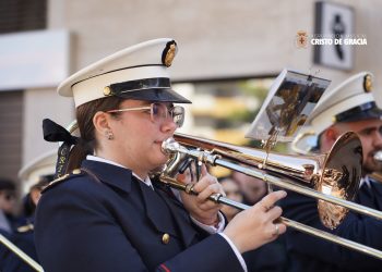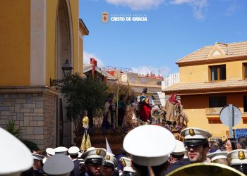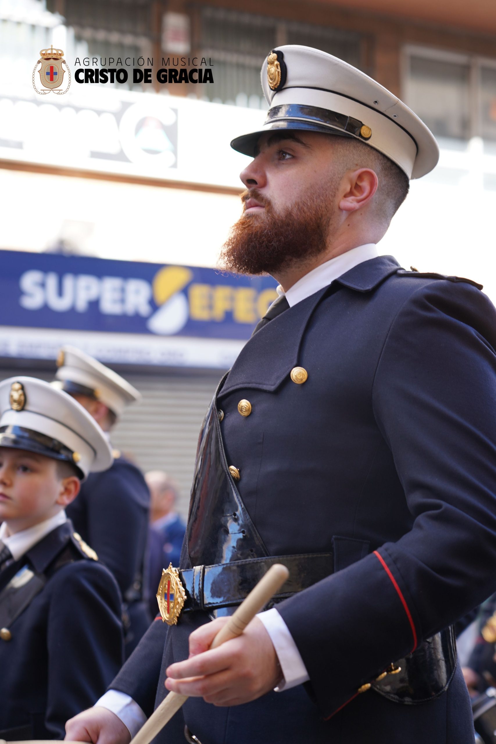 Con el misterio ya discurriendo a buen ritmo en su camino hacia la Carrera Oficial, nuestra Agrupación Musical comenzó a desgranar su repertorio. Uno de los instantes más bellos e íntimos del recorrido se vivió al alcanzar la imponente estrechez de la calle Almenas. Allí, la conjunción entre la cuadrilla y nuestros sones se hizo palpable; marchas como Entrada en Jerusalén, Tu Mirada, La Santísima Trinidad y Santo es el Señor resonaron abrazando al Señor de la Salud entre los estrechos muros.