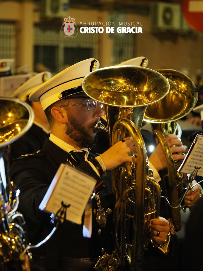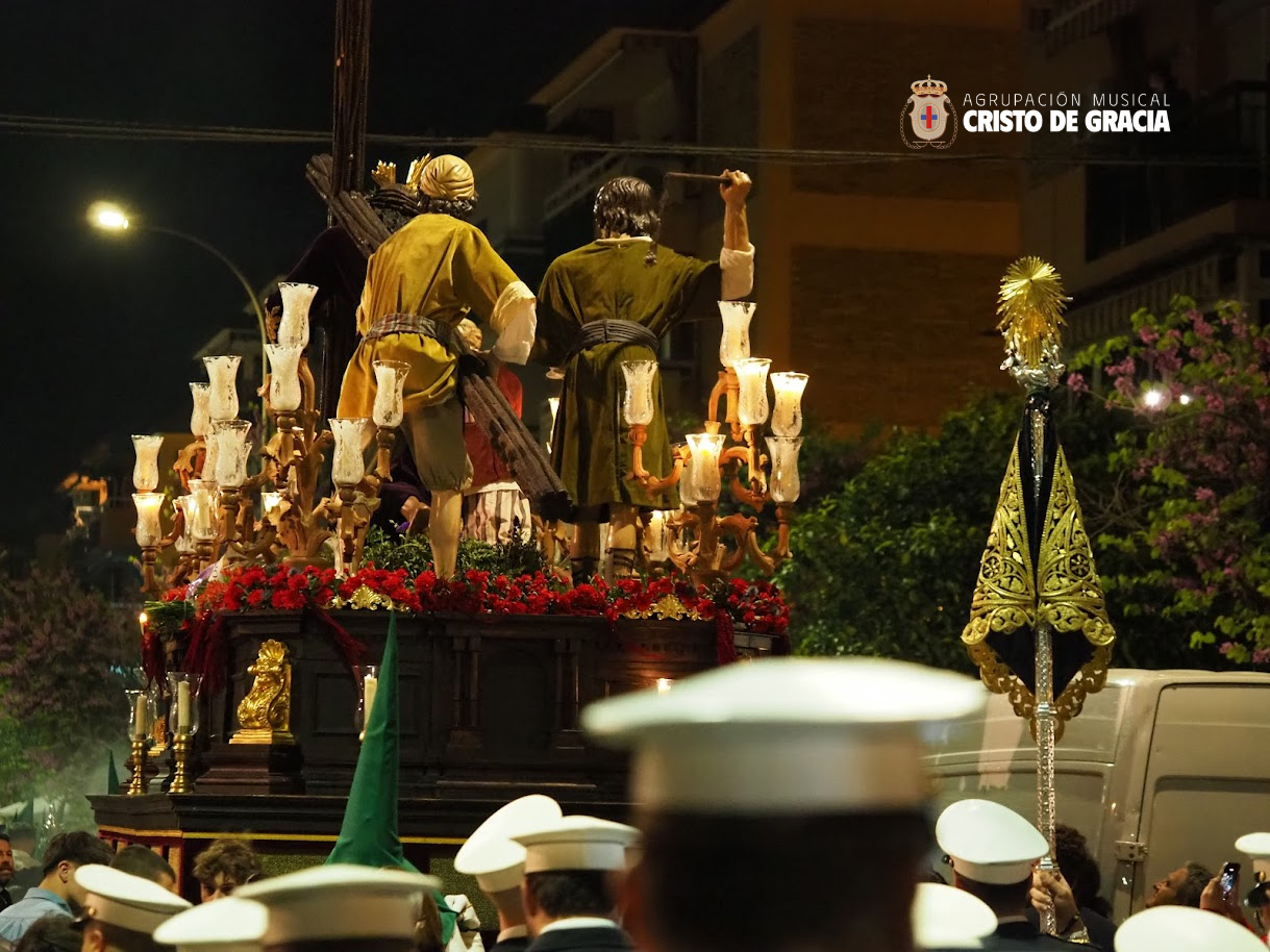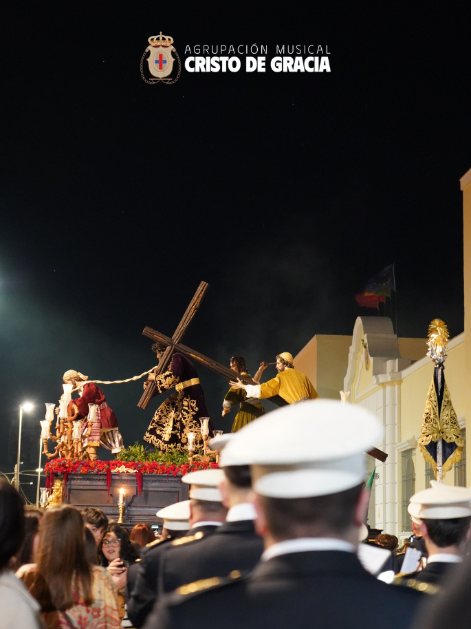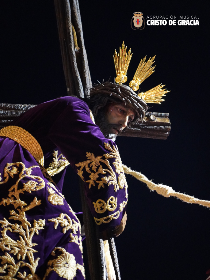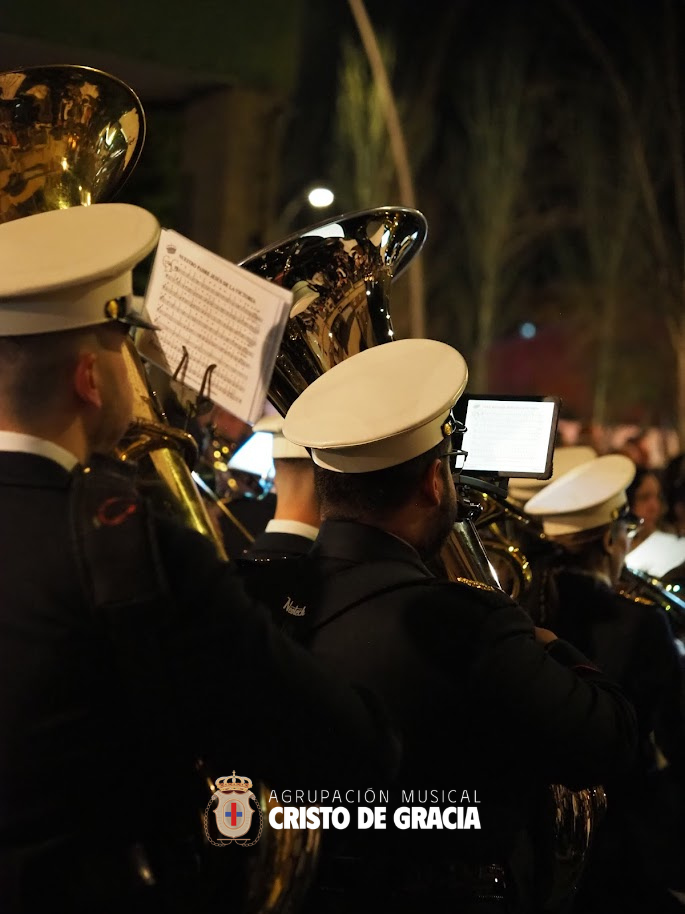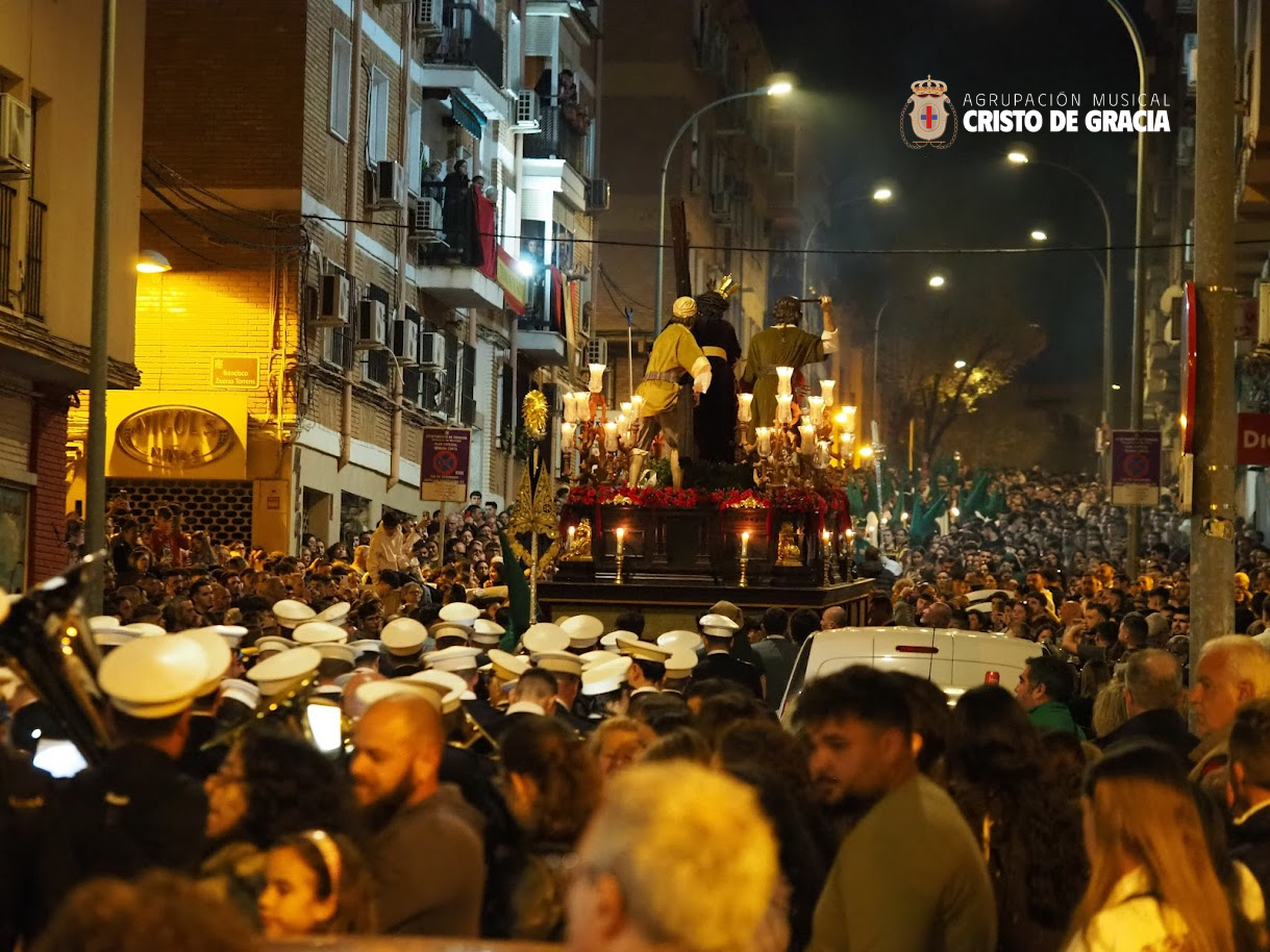 Uno de los momentos más memorables de la jornada se vivió a la llegada de la popular cuesta de la calle Historiador Jaén Morente. Completamente arropado por el calor incondicional de sus vecinos y del resto de la ciudad, el paso de misterio avanzó a los sones de nuestra formación. Marchas como Tu Mirada, Lux Resurrectionis, Prendido por Amor y ¡Tú eres Victoria! resonaron en este enclave tan espectacular, fusionándose con el rachear de los costaleros y creando una atmósfera mágica en la noche del barrio.