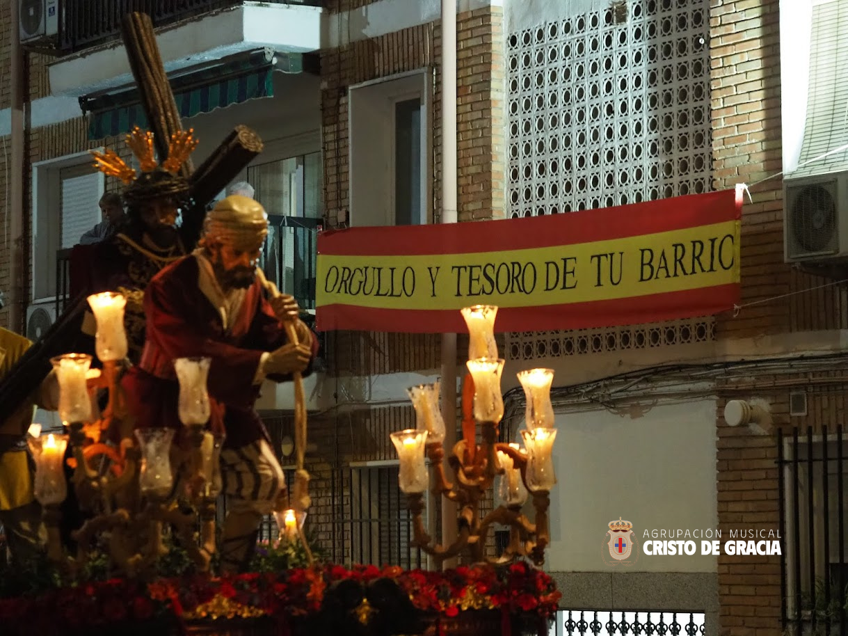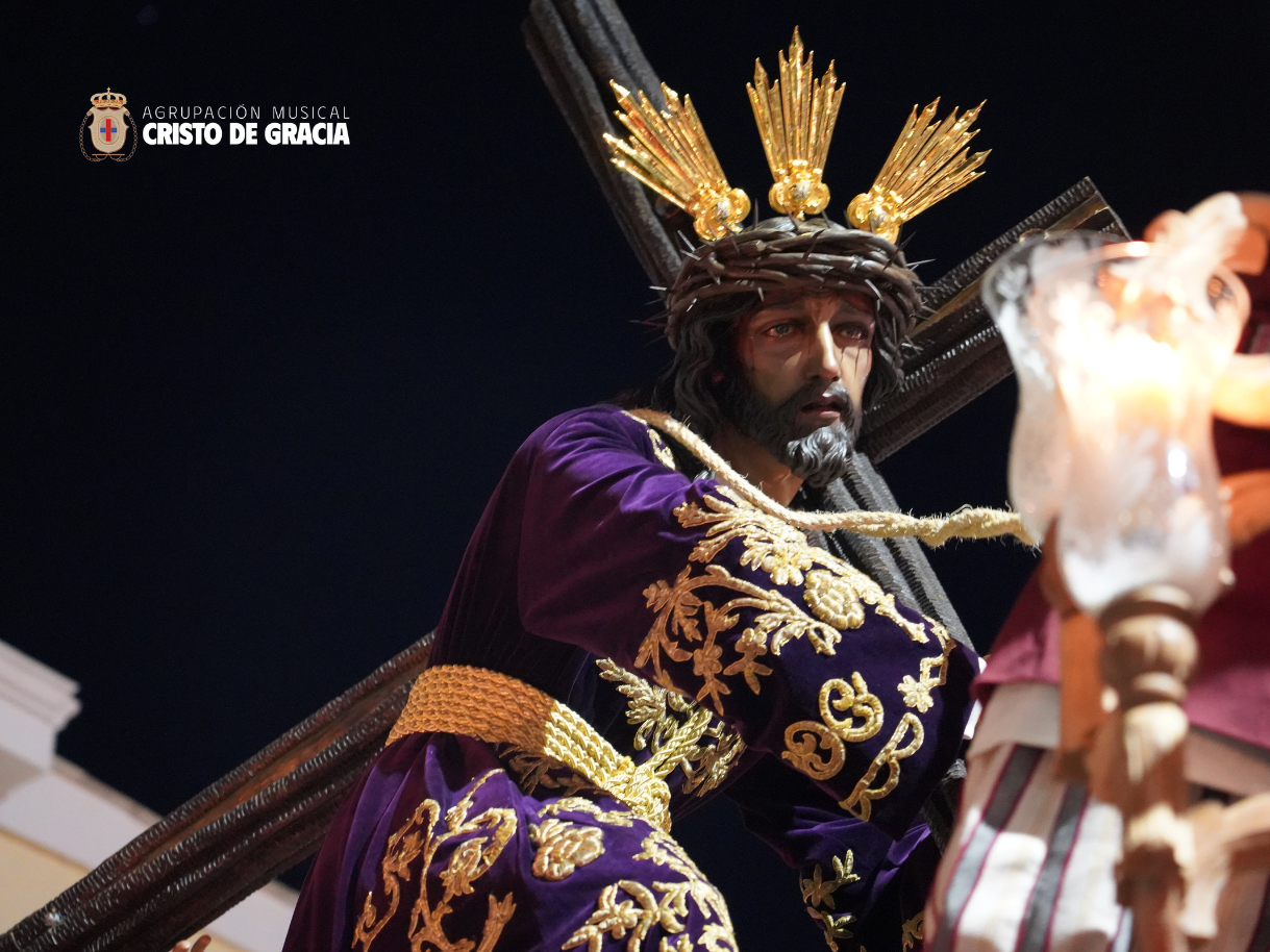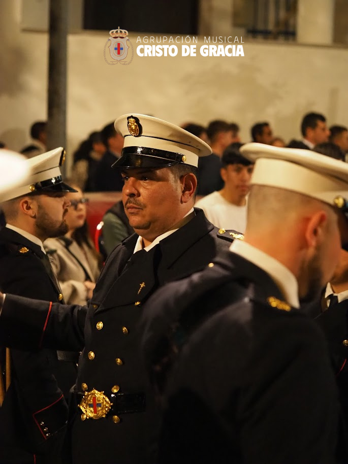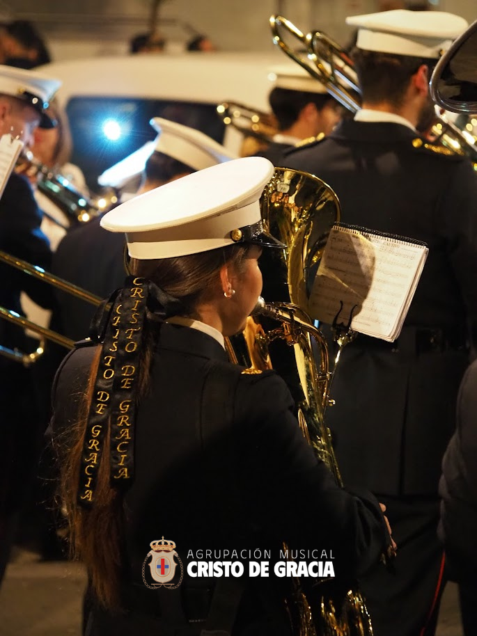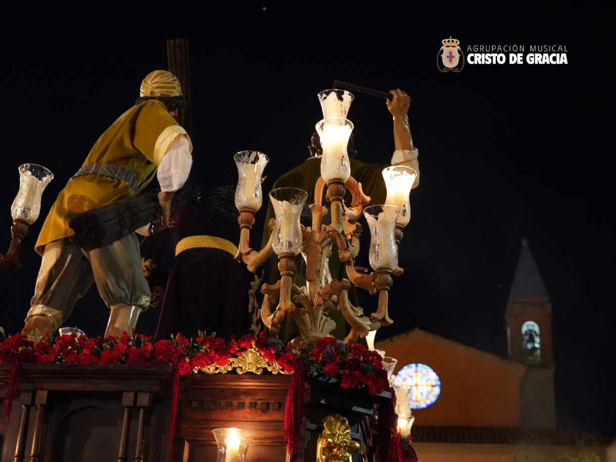 Uno de los momentos más memorables de la jornada se vivió a la llegada de la popular cuesta de la calle Historiador Jaén Morente. Completamente arropado por el calor incondicional de sus vecinos y del resto de la ciudad, el paso de misterio avanzó a los sones de nuestra formación. Marchas como Tu Mirada, Lux Resurrectionis, Prendido por Amor y ¡Tú eres Victoria! resonaron en este enclave tan espectacular, fusionándose con el rachear de los costaleros y creando una atmósfera mágica en la noche del barrio.